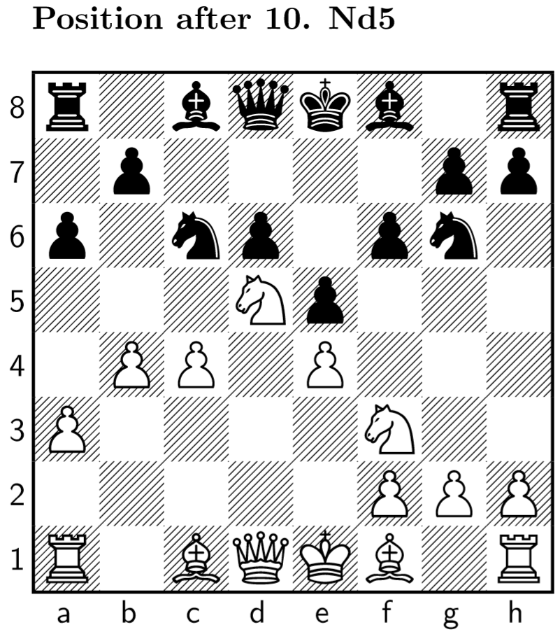 8 … Nge7 9 b4 Ng6 10 Nd5 Be6: According to the computer 10 Be3 would have been way more powerful, developing the piece and keeping an eye over the weak b7 square. The bishop move of my opponent is necessary to contest the strong white center.