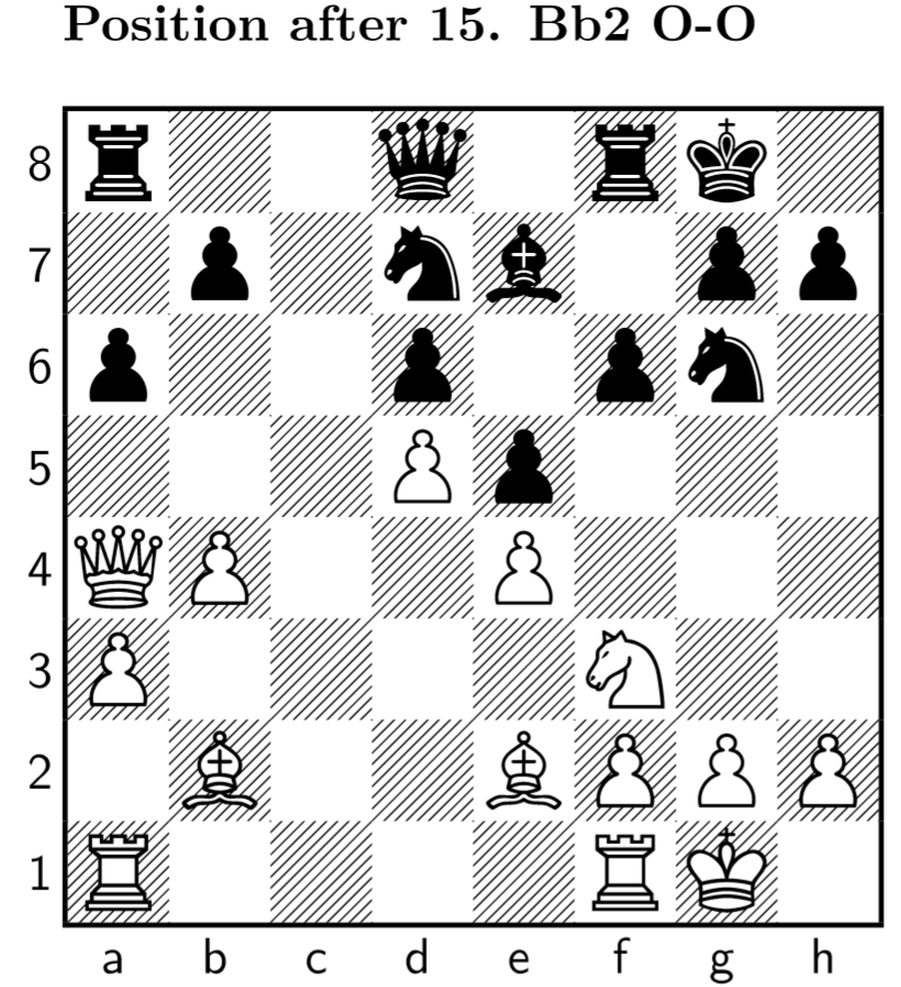 14 O-O Be7 15 Bb2 O-O: The white bishop move loses a lot of advantage because it allows the knight to come f4. From there it can attack the light-square and dark-square bishop going to d3 and b2. The light-square bishop is due to the absence of the its counterpart a huge asset and an exchange with the black knight is therefore disadvantageous. Luckily for me, my opponent didn’t see this.