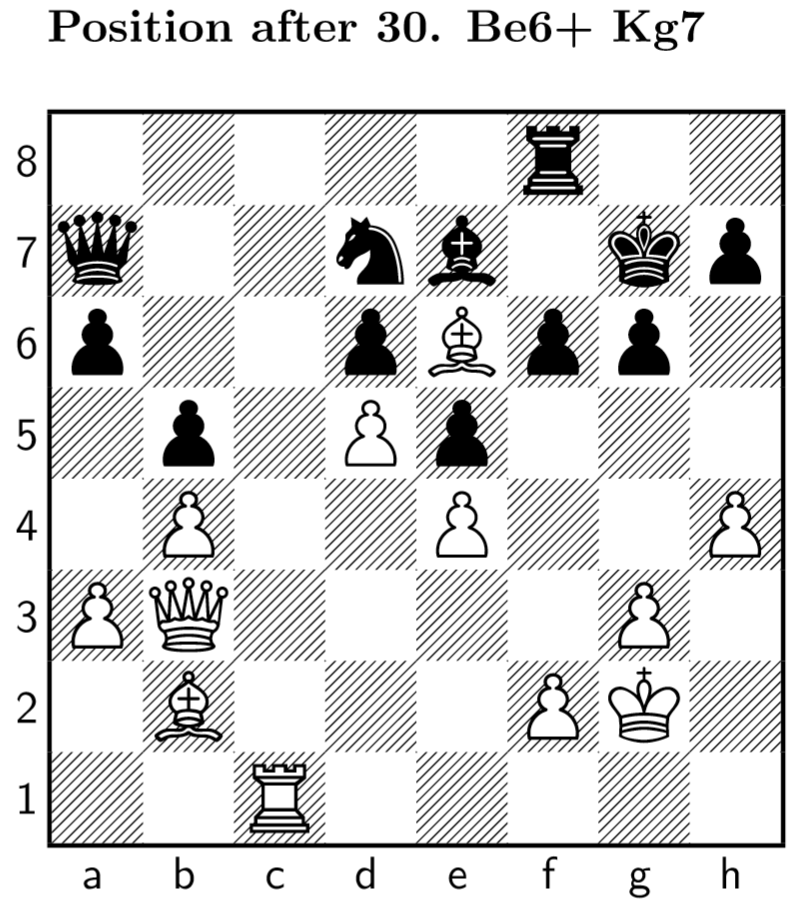 24 … Bd8 25. Bg4 Ne7 26. Nxe7+ Bxe7 27. Rxc7 Qxc7 28. Rc1 Qa7 29. Kg2 g6 30. Be6+: I install the light-square bishop deep in black’s camp with check. It’s almost impossible for black to dislodge it as the black knight cannot reach it in a few moves.